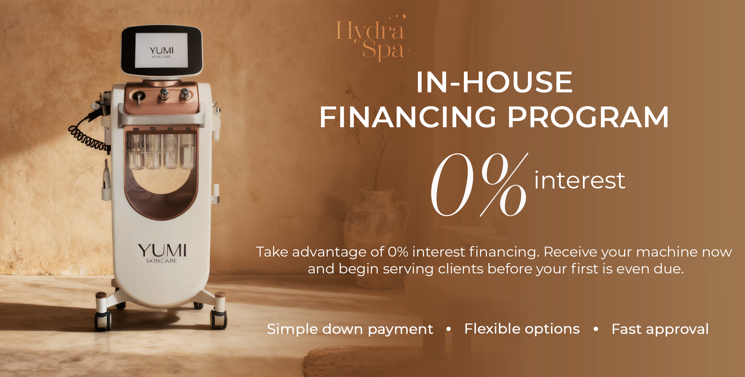 Imagine owning the most advanced facial technology without the stress of huge upfront costs. With our exclusive in-house financing, you can secure your HydraSpa machine today with a simple down payment (almost half), and pay the remaining balance in convenient monthly installments - absolutely 0% interest.